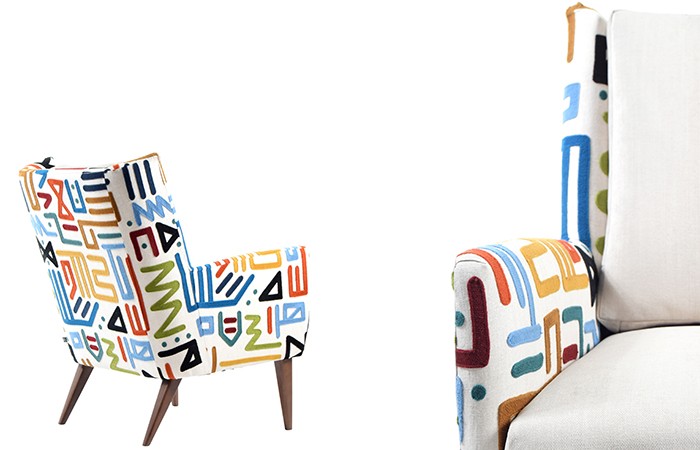 A pattern reminiscent of the 1980’s Memphis Group’s abstract geometry and Keith Haring’s pop stylings gives these Goodwood lounge chairs punch. Here the collection piece uses upholstery to showcase the graphic motif from fabric designer GP & J Baker.
