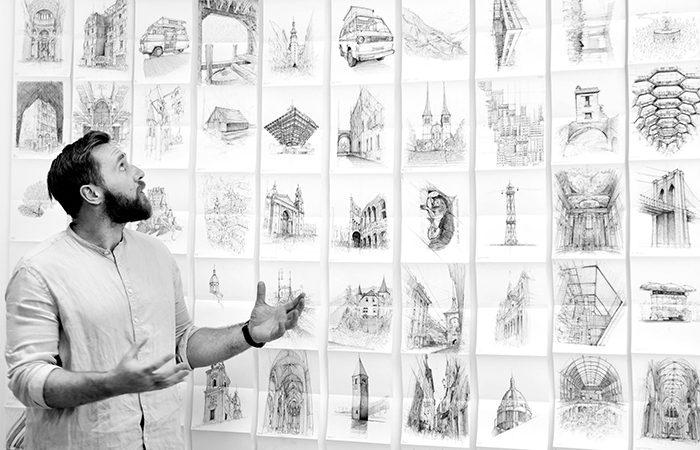 Following the talk, Luke encouraged everyone to pick up a pen and piece of paper and then find an interesting perspective within the showroom to capture, with the chance to win a limited edition print of his work. Without hesitation, guests spread out in groups or on their own to set about drawing.