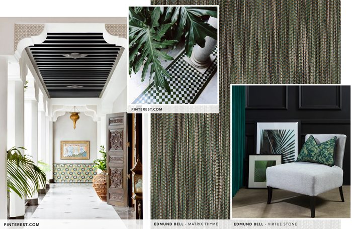 Dynamic colours inspired by ornate pattern usually dominate, but the cool colours of the ocean can also feature strongly. Tiles of course play a huge part in Moroccan design and the pattern element is truly inspirational! The plain colours from MATRIX and EQUILIBRIUM can capture that ocean inspiration.