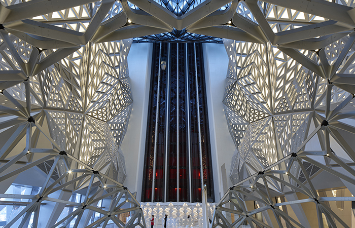 In-between the free-form voids that traverse the atrium, a series of bridges create unique spaces for the hotel’s restaurants, bars and guest lounges by renowned chefs including Alain Ducasse and Pierre Hermé. The atrium’s twelve glass elevators provide guests with remarkable views of the hotel’s interior and exterior as they travel between the voids of the building.