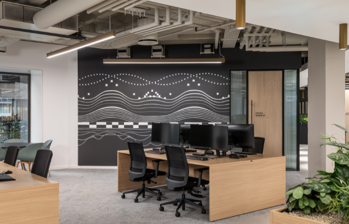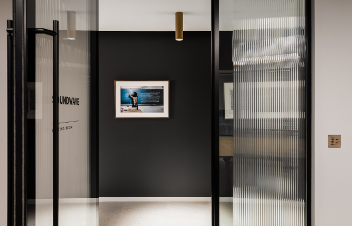 Two hand-painted murals frame the open-plan workspace in a monochromatic palette. Undulating wave forms echo audio recordings as they move through platforms and gates, mirroring Ice’s copyright technology where music is translated into data. Subtle references to code are embedded within the artwork — a level of detail that reflects the company’s technical precision.