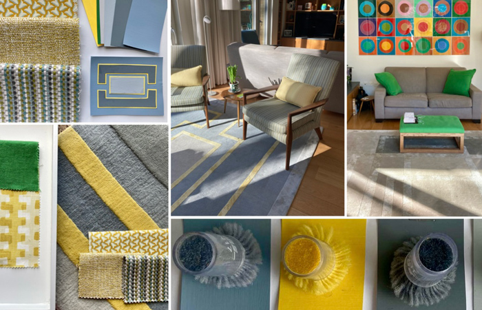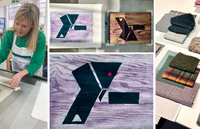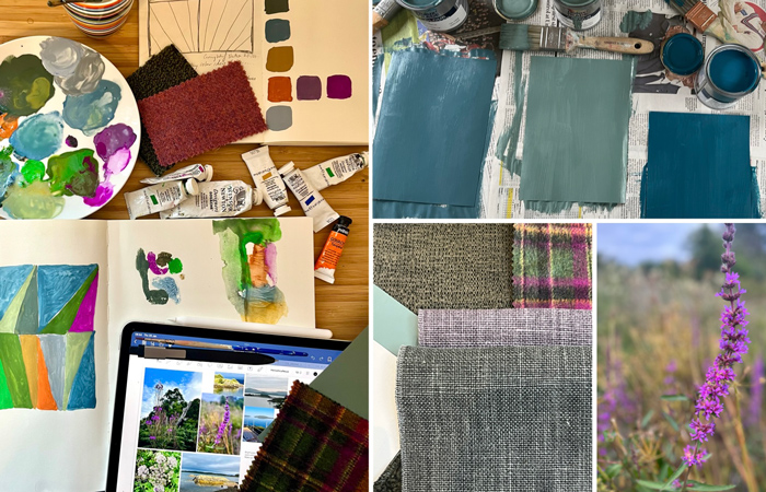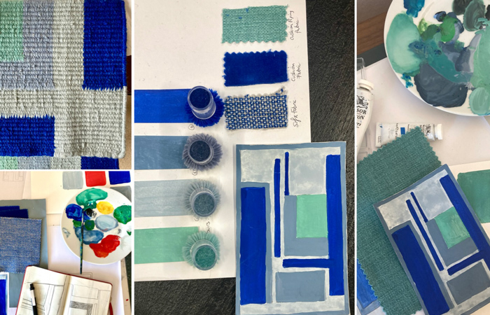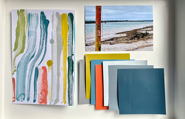 If it is a painting, piece of artwork or the surrounding landscape I then start to create a colour palette around this. I select fabric samples, I mono-print with the colours to explore the % mix of colour. Then often move on and Mokulito print with the architectural plans and colours so we start to have creative fun with pattern and colour.