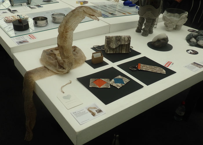 For example I spoke to one graduate who had used snake shedding in replacement for the actual skin therefore removing animal cruelty from this type of product. The products created look of very high quality which I was surprised by as the shedding was very thin. However I found out that the shedding had been layered and laminated together to create a vivid look. I think this idea is very useful as it removes the cruelty and waste that connotes snakeskin products.
