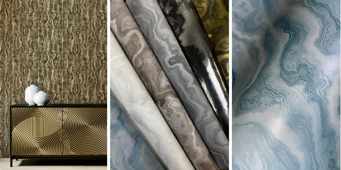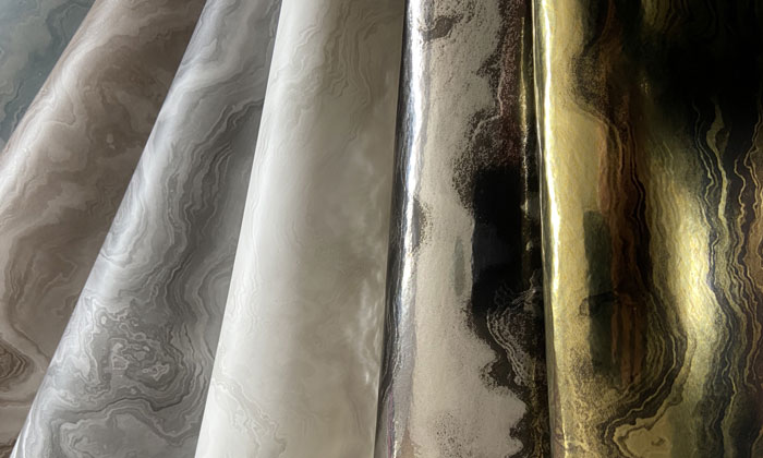 Based in mid-Wales, it was only apt that Newmor chose Marmor meaning marble in Welsh as the name for their new collection. Rose Campbell said, “Our new marble inspired design is full of movement and intrigue. We’ve created two finishes – the matte options are subtle and sophisticated reminiscent of polished stone or artistic paint effects, while the high shine mylar base adds show stopping drama to this collection”.