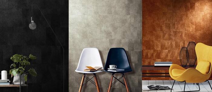 Sorrento is a burnished tile effect available in 19 lustrous metallic and buffed matte tones. The deeply embossed surface catches the light, and metallic inks create a dramatic ever-changing effect. In contrast, the matte colourways have an attractive rough plaster quality.#