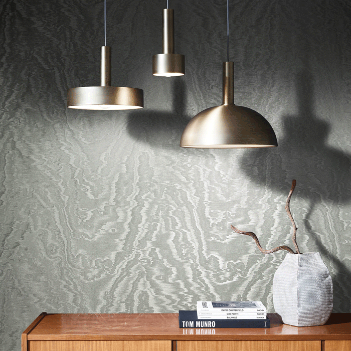 A design that is worth exploring in more detail; a moire effect wallpaper that captures the shimmery fluidity of silk. It’s structure and light refraction results in an organic, wavy effect, enhanced by subtle glitter and glass beads. Furthermore, every roll of wallpaper is unique. The application of the general pattern is controlled during production, however there’s a random application of small dots, meaning no two strips of wallpaper are the same.