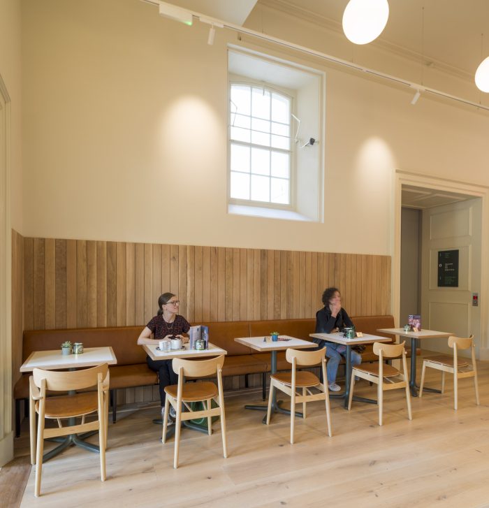 Inclusivity and accessibility were particularly important in the design of this project. The RWA focuses on being welcoming for all ages, including families, so the space had to be easy to navigate for parents or carers with buggies or small children. There is a family room nearby for changing and feeding babies and the Academy also runs activities for family art lessons during the holidays. All lettering on menu boards has to be in large font sizes for legibility by all user groups, whilst special under-the-counter technology helps project staff speaking volume for people with impaired hearing.