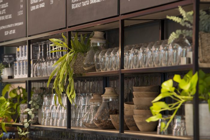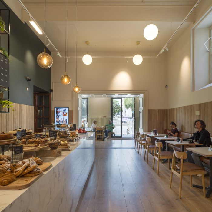 A large-scale wall shelf unit to the right of the main café space, behind the counter area, also serves to balance out the room’s great height and features a powder-coated black steel structure, that has been filled with plants and glassware. Generously-overflowing planting hangs from two round structures in the main café space, additionally helping to create a more intimate feel. Glossy, dark green wall tiling at the base of the wall unit matches a new paint colour for the upper walls (Lick Green 06). The main upper walls of the café are painted in Farrow & Ball’s ‘School House White’, whilst the skirting, architraves and wall panelling are in ‘Off White’, also by Farrow & Ball.