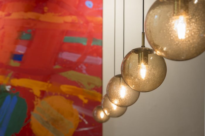 Flooring throughout is in ‘milky coffee’ oak, matching the oak chevron flooring of previous Spicer & Cole outlets, whilst the ceiling is painted white, to lighten the space and counter-balance the dark wood of the main entrance door from the foyer. Lighting is a mixture of track lighting to highlight the food display area and the art on the walls (chosen by the RWA), plus white globe pendants to punctuate the overall space and five smoked-glass pendants directly over the counter area.