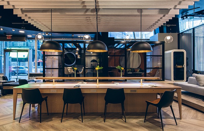 Productivity Table: a communal table that allows guests to work, eat & drink, and linger together or alone. Not only does this table have thoughtful built-in functionality (e.g. plugs, charging), but it also allows the individual, amongst many at the table, to make their seat their own through personal lighting, lamp controls, lockable drawers, etc.