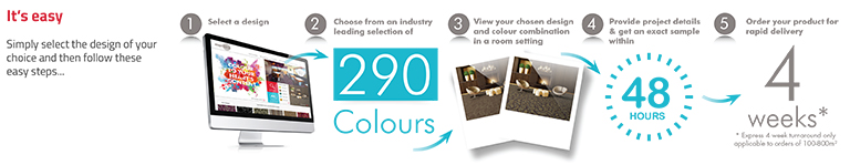 Key for designers, an online design studio tool has been created specifically for Colortec+ Express allowing you to view designs in different room settings and then recolour to your hearts content, selecting from Newhey’s spectrum of over 290 colours. This is available at: http://www.colortecexpress.co.uk/