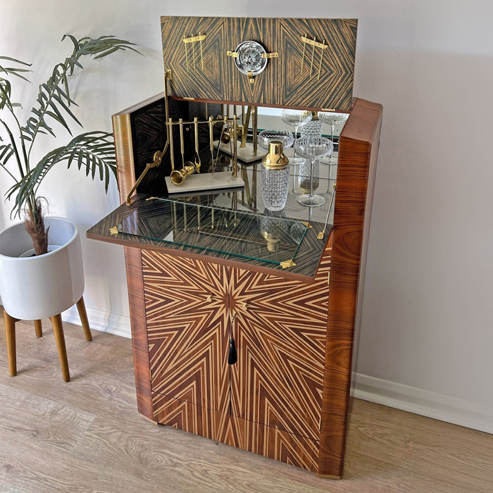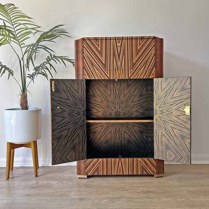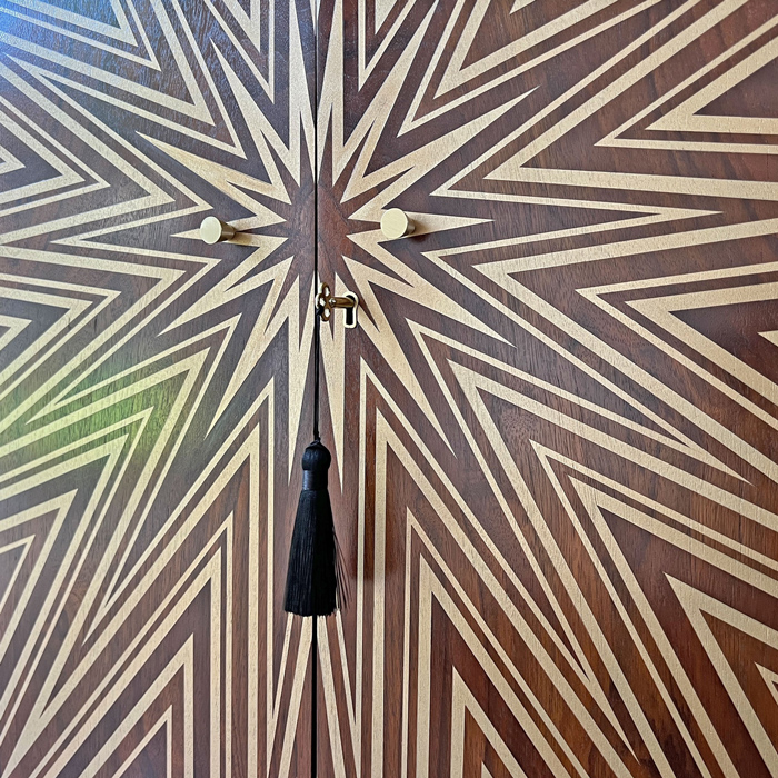 “I was thrilled to see my Starburst artwork being used in a different medium and in such a unique way. My Starburst was the first artwork I created whilst working on my first custom range when I started at Newmor straight out of university. I had the same excitement seeing the cabinet on social media as when I realised that it had got picked for our range 6 years ago! The inspiration behind my Starburst was from the Roaring 20’s, and I love that it’s been recreated and used on a drinks cabinet as that is what I imagined where it would be displayed! I had seen these Starburst’s from that era and from my favourite movie ‘The Great Gatsby’. I had used an existing texture from our archives to create the Starburst and it works perfectly with the Walnut! Kayleigh has created a truly beautiful piece.”