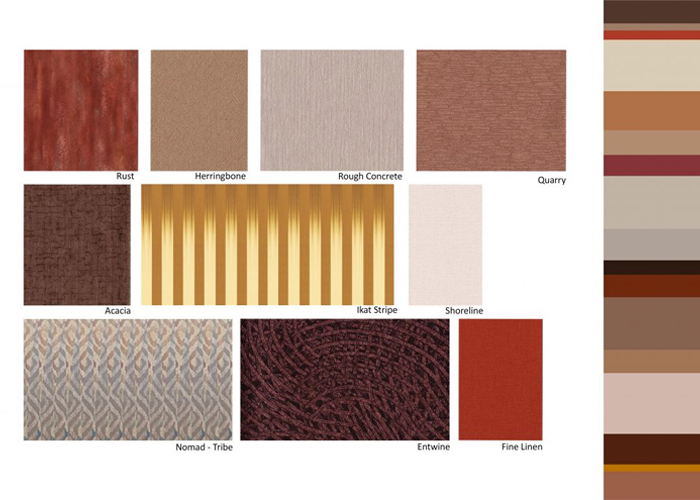 Rough, worn surfaces and burnished metal finishes combined with thoughtful design create a warm but strong base for this trend. Weaves, tweeds and traditional fabric-making techniques also feature. The dark masculine pallet is dominated by burnished metals, bitter chocolate, russet, slate, charcoal and mustard. The Pantone colours of the year, ultimate grey and illuminating, are given a new twist with the brown hues that sit beside them.