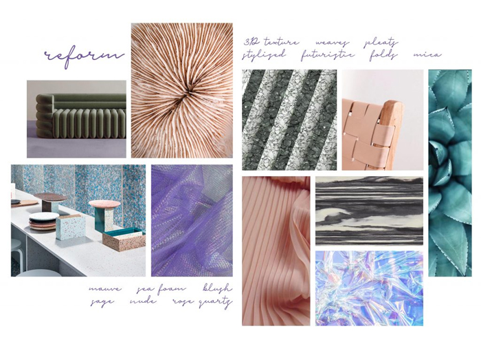 Folds, pleats and weaves are also also feature heavily in this trend, creating a deep 3-dimensional effect. Smooth chalky surfaces like sea glass are also important. Key colours include mauve, seafoam, blush, sage, nude, rose-quartz, teal, mica and iridescent finishes.