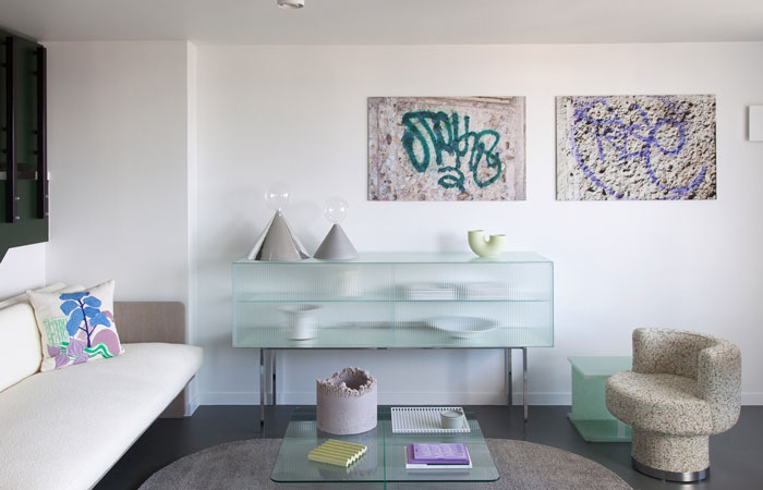 The 2LG Studio apartment combines Brutalism with contemporary design through a material, texture and colour palette that includes concrete alongside aluminium, jesmonite and fluted glass. 2LG Studio brings a strong edge to the urban aesthetic with its approach to lighting and furniture design, and consciously softens this experience with layers of deeply textured natural fabrics. The apartment features an exclusive new version of the design studio’s Capsule light and Stanley table, along with a bespoke series of rugs from its latest collection. As print is central to the studio’s approach, it has created a new series of wallpapers, soft furnishings and photographic artwork inspired by the Grade II*-listed building, which form a collection available to buy. The studio has also collaborated with a number of exciting new and emerging designers on bespoke pieces.