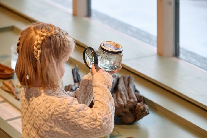 One of the main goals of the exhibition design was to make the content engaging for all ages. Play is a powerful tool for learning and it was important that this was a playful space where younger visitors can explore, touch, experiment and engage in a multi-sensory way. Information is aimed at a wide variety of audiences, but includes plenty of sturdy physical interactives for children and even ‘hidden’ elements just for them, such as drawings and activities at child height and troll tunnels only children can access.