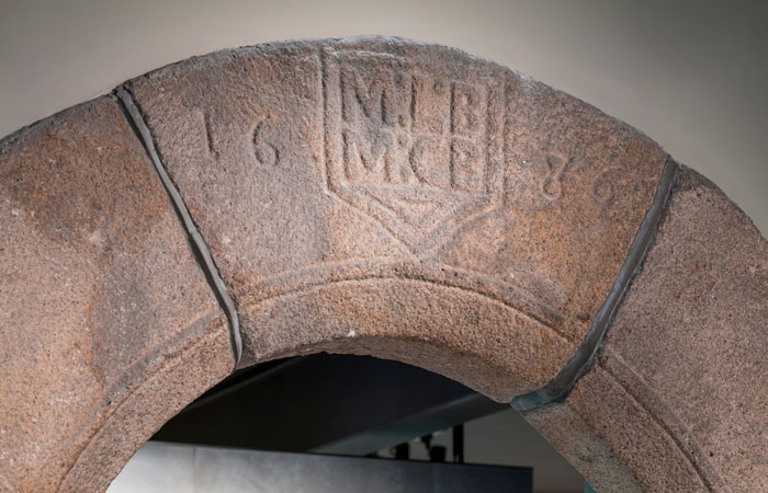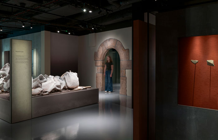 The design team sought to make the retained architectural features feel cohesive within the exhibition environment and as objects in themselves. This was achieved through a high-level lighting detail that creates a wash of light across the wall, drawing attention to its texture and markings. The door surrounds and concrete additions to the historic wall were also painted to ensure they felt integrated into the space.
