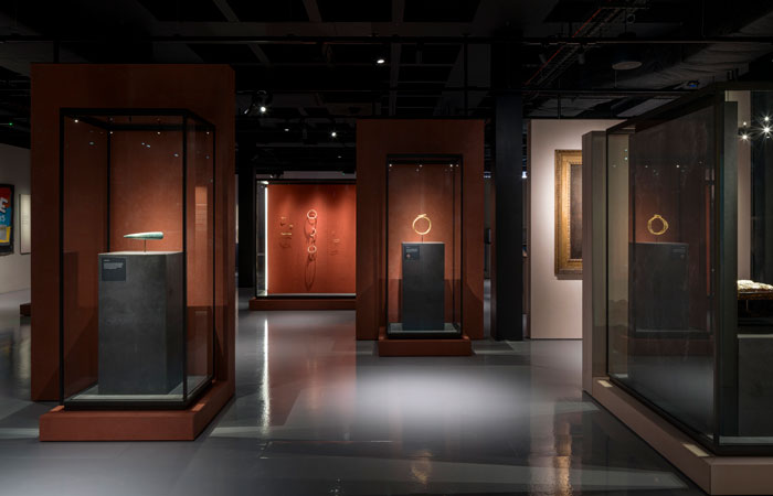 A jadeiete axe and gold torque are key objects and hold the central vista as visitors enter the exhibition.