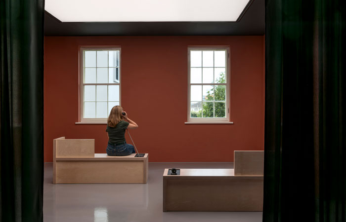 A midway reflection space offers visitors a quiet threshold zone and a visible break from the main exhibition floor. The pause space is separated by a dark, translucent curtain and offers views out to the harbour. There are no objects displayed here, only interpretation, including sound-only content about the local language, Jèrriais.