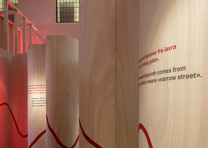 The form of the exhibition is inspired by the idea of the labyrinth, where the visitor, just like the hero detective of Nesbø’s books, follows a number of winding paths, whilst tracing threads of clues. The literal idea of a thread also relates to the labyrinths of classical Greek mythology, where Ariadne follows a thread through a labyrinth created for her by Theseus.
