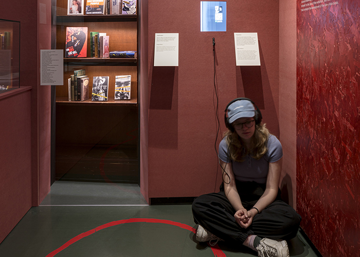 When visitors first arrive, they are met by a towering, theatre-scale graphic wall in a dramatic black, grey and red colourway, including three doors and with a giant fingerprint integrated into the design. Visitors are directed towards the seemingly ‘correct’ entrance, only to find the route is actually a cul-de-sac ending in a trick door that opens onto a library shelf of books. The visitors then come back out and go through the real door, understanding immediately that their path through the exhibition will not be straightforward and that the exhibition will encompass both clues and dead ends.