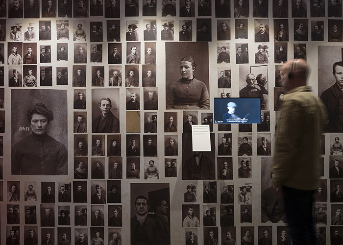 A ‘Police Procedural’ area uses four angled cameras to film visitors as they go through the exhibition in real time, underscoring the idea of surveillance, whilst a ‘crime wall’ mimics the visual language of an actual crime investigation wall, with backlit negatives and mugshots, including mirrored areas so that visitors can see their own faces in amongst the potential suspects. Prisons and education form the subject of further theme areas, as well as Jo Nesbø the writer himself, with a window at one point through to a display of his books within The National Library.