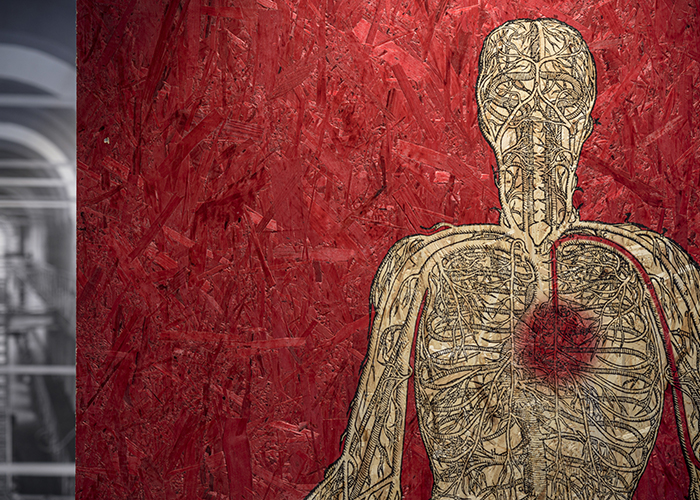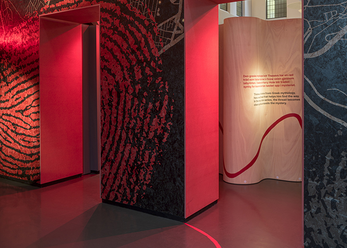 A model of the labyrinth is introduced at the outset, serving as a map, so that visitors know what kind of journey they’re embarking on. Maps also have a special place in the Harry Hole novels, with Hole often actively using a map to find messages left by a killer or to decode secrets the killer is trying to conceal. Their route through the space includes curved plywood ‘labyrinthine’ walls. Recognising that a sense of place is important to us as humans, Nesbø always makes a point of describing the geography of the setting, starting with the human body and the experience of being. The aforementioned thread, meanwhile, finds form in the exhibition as a wandering red line, painted on the walls and floor.