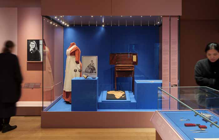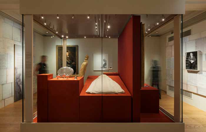 Visually, these approaches were expressed through interplays of presence and absence; revealing and unveiling; illumination and the shedding of light on what was previously unseen, bringing new stories into focus through strong colour and vibrancy. This can particularly be seen, for example, in the bold reds and blues of the new fabric linings inside the exhibition’s showcases. The paint colours used for the walls refer to the historical focus period of the exhibition, whilst complementing the bright fabrics used for the display cases via a rich-but-muted colourway. Ordinary objects from the past are also brought to the fore throughout the exhibition to illustrate the working lives of palace staff.