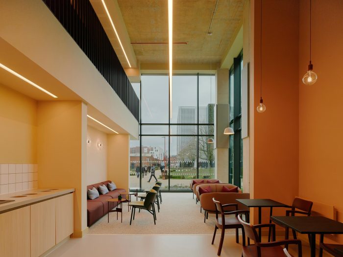 These workspaces overlook the vibrant activity below and enjoy expansive views across Ancoats Green, reinforcing the interior’s connection to its natural surroundings. The result is a welcoming, healthy environment that encourages social interaction, fosters a sense of community, and feels both grounded and uplifted by its relationship with the landscape.