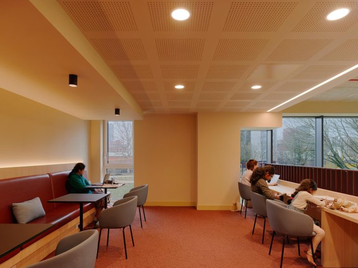 “The interior scheme draws inspiration from the wildflower gardens of Ancoats Green, visible through the amenity’s two-storey glazed façade. Subtle, grounded hues evoke a sensory connection with the surrounding landscape. The palette is warm and inviting, yet purposefully avoids predictability through distinctive tonal combinations – rich claret, soft cornflower blue, buttery cream, and shaded taupe with undertones of khaki.”