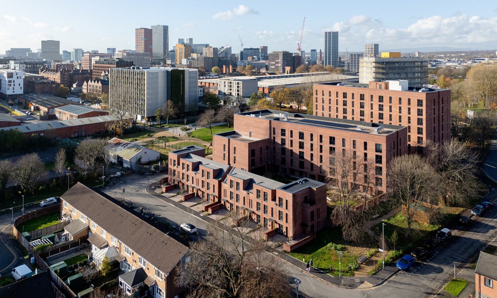 The project forms part of a broader public realm strategy that positions Ancoats as a low-carbon, sustainable neighbourhood, with a strong emphasis on active travel, walking, and cycling. Essential to the design is ensuring that the development contributes to Manchester’s 2038 Zero Carbon ambitions by providing well-insulated homes that will lower energy costs for residents. An extensive landscape scheme and a significant number of new trees have been planted as part of the placemaking public realm works, whilst the townhouses also include a parking space with electric vehicle charging points, and private gardens to the rear.