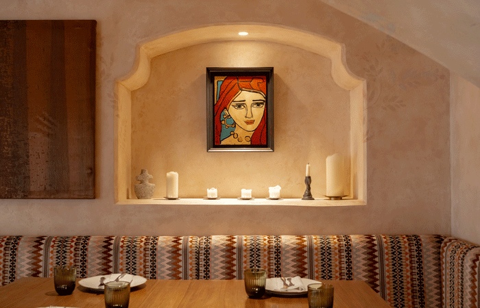 DLSM Studio have delivered both the branding and interior design for Noreen, crafting a refined, Arabian-inspired space that blends traditional craftsmanship with contemporary elegance. Original low arches throughout the restaurant have created intimate alcoves within which diners can enjoy their meal. Finished in stucco plaster, the walls are layered with bespoke hand-painted delicate floral murals that add depth and cultural richness.