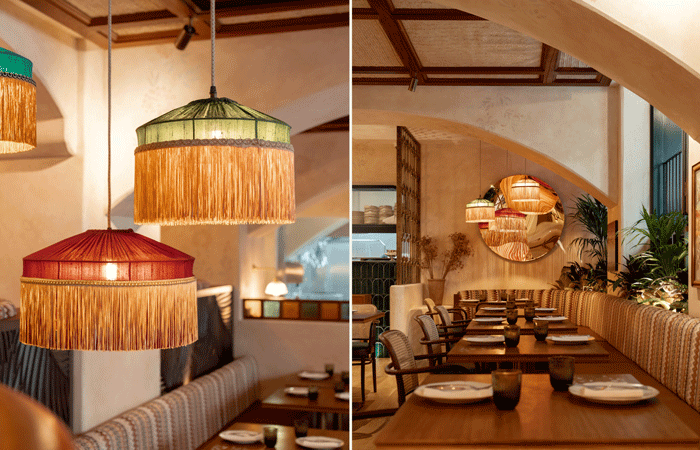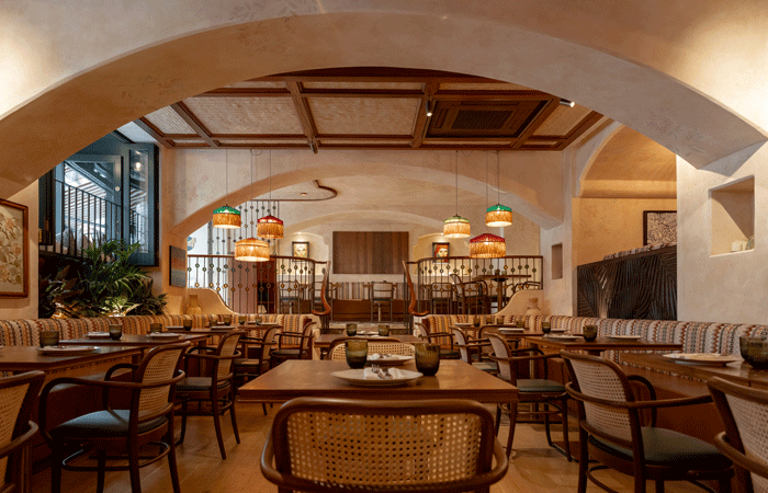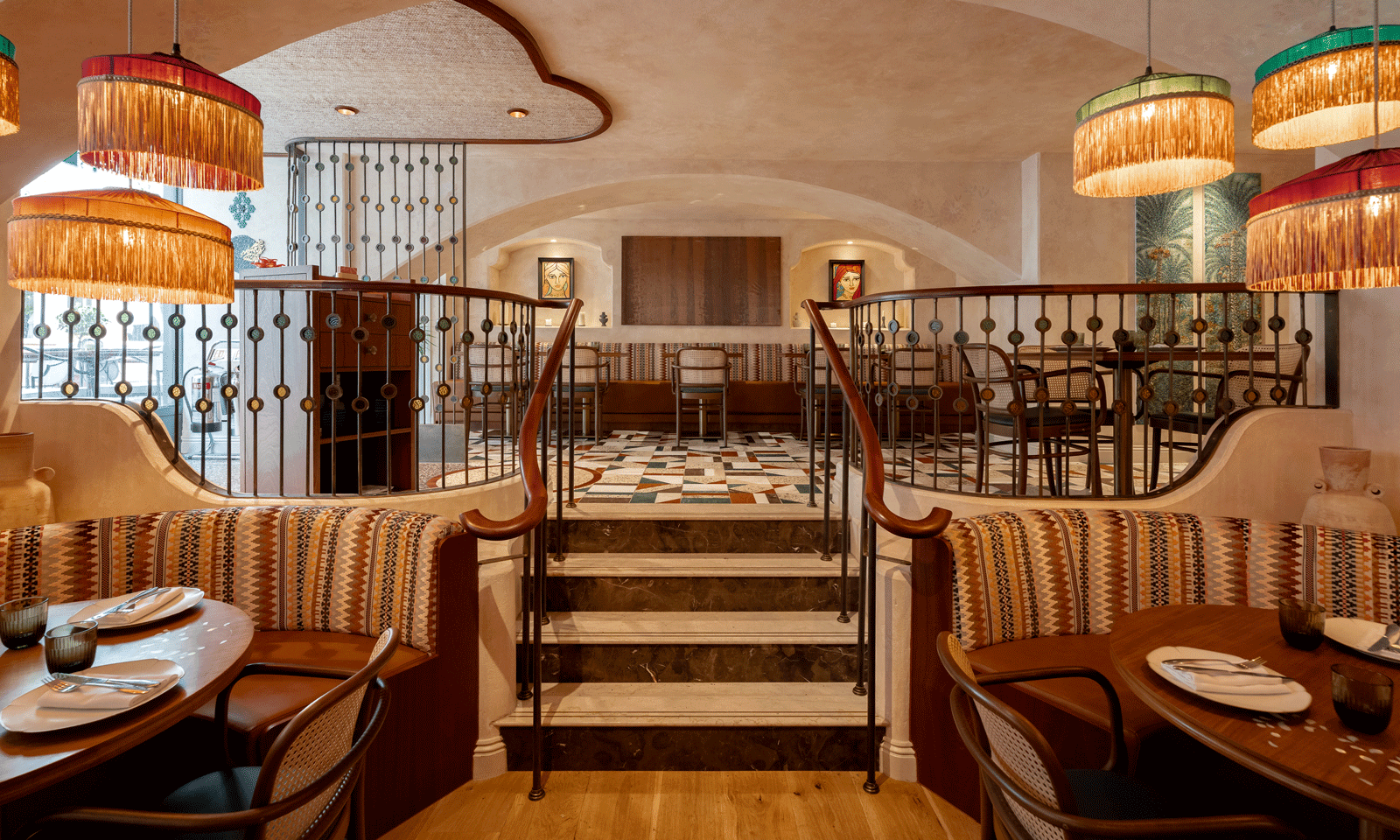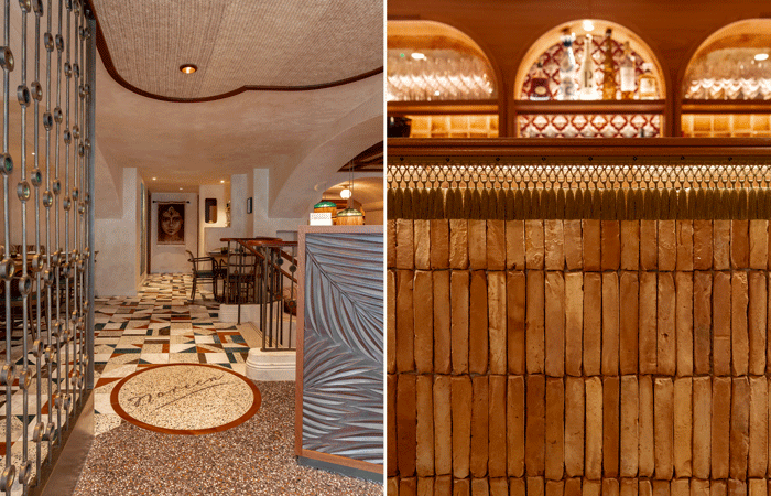 The floors are lined with intriguing bespoke marble and terrazzo tiles, with the restaurant’s name proudly engrained into the finish. Natural materials, including ceiling rafts woven with palm leaves imported from Bahrain and a brass-and-stained-glass balustrade inspired by traditional Middle Eastern building methods, add authenticity and visual intrigue.