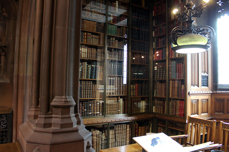 The Historic Reading Room is still used today and remains part of the study areas available to students of Manchester University. The stained-glass window depict historical figures that have achieved success for literature, the arts and science. As a Grade 1 listed building the fittings and furniture are well preserved and on each side are alcoves filled with books and historic volumes for personal study.