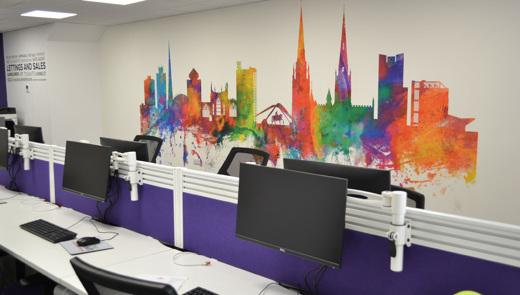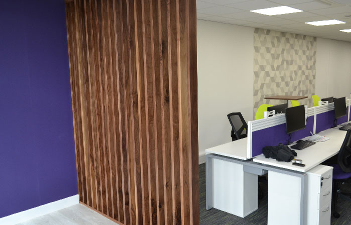 The installation of suspended ceilings, lighting, air handling, wall linings and flooring were enhanced by feature walls and the creative use of furniture from Lee & Plumpton. The addition of walnut slatted screens allowed separation of the spaces whilst still maintaining the overall design concept. The finished office features a high impact, colourful mural depicting the Coventry skyline as the centre piece for the project.
