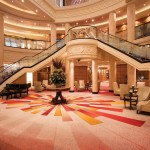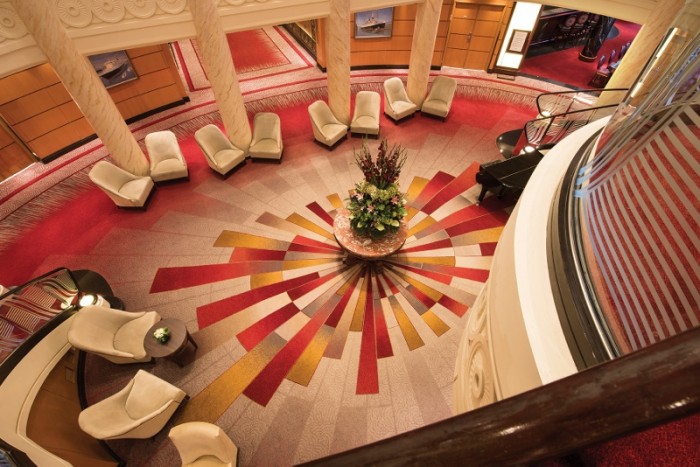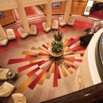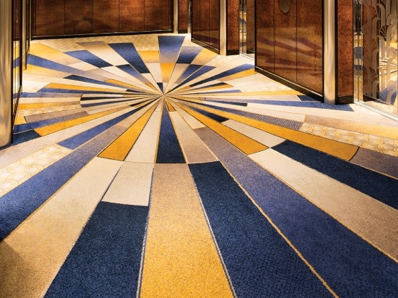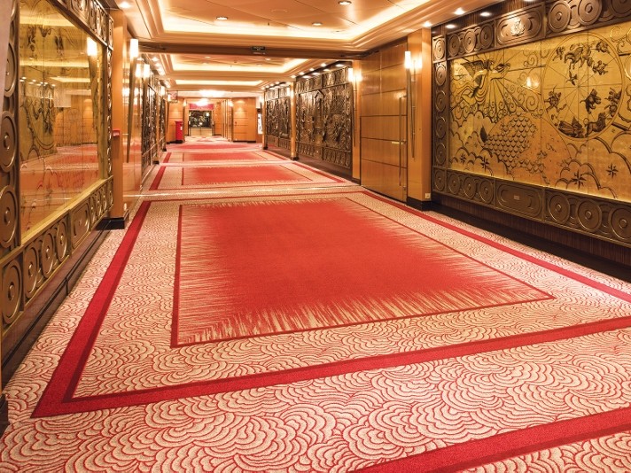 Although the ships interiors are inspired by the history and regal heritage of the ship, the ‘Ulster’ carpets bring an element of modernism while fitting in perfectly with the traditional aspects. The colours were carefully selected to complement the striking designs, with royal reds, golds and deep sea blues flowing under your feet. The most fabulous carpeting feature is without a doubt the retro style ‘starburst’ carpet in the main atrium, which is undoubtedly the show piece of the ship.