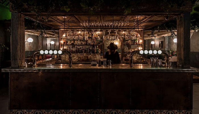 Overall, the interior treatment evokes a once-glorious past, with a fairly beaten-up aesthetic, including reclaimed elements such as decorative panels made up of wrought-iron table legs.
