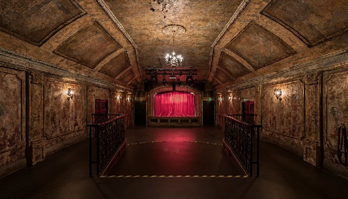 ‘It has been a hugely collaborative project in order to realise Ben’s vision of ‘distressed Havana’’ for the interior look, Nigel Tresise added, ‘with many elements of the decoration curated by branding specialists Studio Juice, who have worked with Ben on a number of Mumford & Sons projects. Once we had created the main venue space, we handed over to legendary set designer Dick Bird whose ornate stage proscenium and wall finishes were implemented by Scott Fleary Productions. Bar joinery specialists Fantastic Bars created the bars, whilst Cantilever supplied the specialist bar equipment and Nancy Nicholson created the incredible distressed paint effects for the walls, with layer after layer of paint added and then partially-removed to achieve just the right look.’