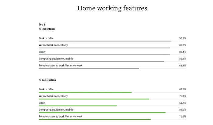 The office also really came into its own when looking at the workspaces themselves. Workers found that important features like desks, chairs and computing equipment were far more satisfactory in the office than at home. An office chair, for instance, was deemed important by 90% of respondents, but only 54% found the one in their home satisfactory, with nearly half not pleased with their current seating situation. This can be seen across the board, with five of the nine items featured scoring better in the office than at home, including desks, printing & copying equipment, and wired networks.