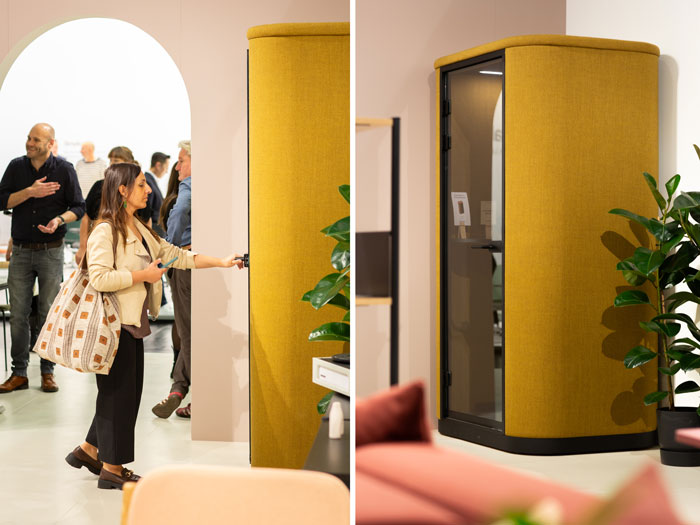 An innovative acoustic pod that enhances privacy and focus in open office environments, ideal for meetings, concentrated work, and providing a quiet retreat within a busy environment.