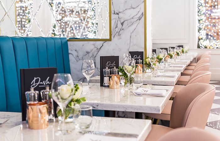 “The design of Dash restaurant is perfect for the venue – a great mix of classic and modern style with the use of marble finishes from Versital combined with modern lighting and metal details.” – Gemma Stockberger, Versital.
