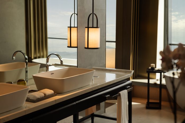 From there, guests are transported to the reception area on Level 75 – conceived as the “Porch” of the house and envisioned as the social heart of the hotel. The lobby is defined by a warm, natural material palette and refined finishes. Double-height brass batik screens filter the light beautifully, casting intricate patterned shadows. Panoramic views of the dramatic city skyline are artfully framed, grounding guests in Kuala Lumpur’s vibrant urban landscape.