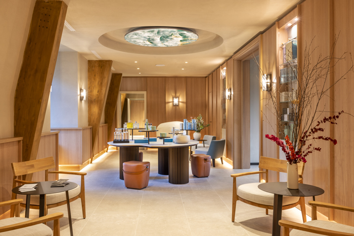 The ground floor is entirely dedicated to well-being, featuring thermal pools, relaxation lounges with steam fireplaces, and saunas and hammams that open onto the garden courtyard and surrounding park. The changing rooms, designed as an integral part of the wellness journey, include custom-built beauty stations and personalized lockers. Inspired by horse stalls, these spaces prepare guests for their spa experience—just as horses were once groomed in their boxes.