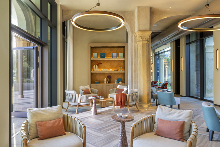 The Scuderie De Montel showcase a fusion of Milanese Art Nouveau and the French equestrian architecture of the Duke of Condé’s stables in Chantilly, home to an international racetrack. This combination allows the past’s visual and artistic richness to coexist with contemporary well-being spaces. Signature Art Nouveau elements, such as wrought iron, intricate decorative details, and flowing furniture lines, shape the interiors. THDP has also designed bespoke lighting, using materials and forms reminiscent of the era, featuring glass and iron to reflect the delicate elegance of Art Nouveau.