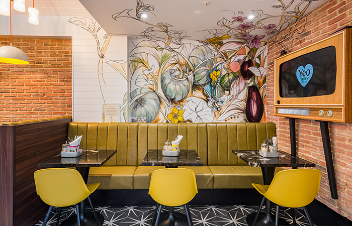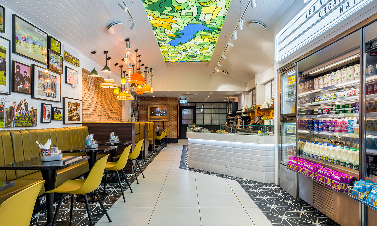 The rear wall features a large-scale retro-style TV against the exposed brickwork, telling the ‘Yeo TV’ brand story visually (without sound) and offering a distraction for anyone queueing to pay at the back-right pay counter.