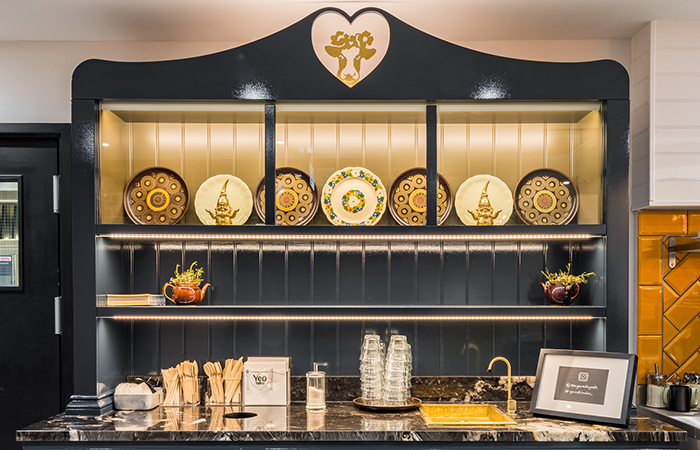 As customers arrive at the pay-counter, a large, glossy, petrol-blue dresser, bespoke-designed by Phoenix Wharf, catches the eye against the backwall.