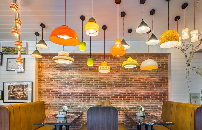 A lighting feature made up of a clutch of 19 pendant lamps in different designs and set at different lengths hangs over the booth seating and catches guests’ eyes as they enter. The final third of the left-side wall houses a cottage-garden-inspired mural by artist Natasha Clutterbuck.