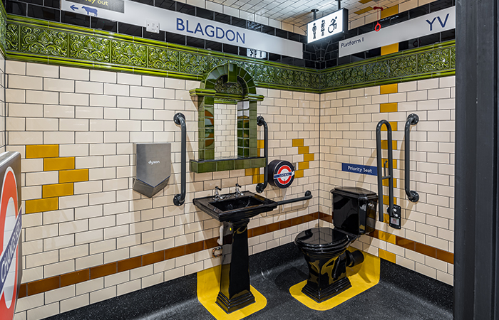 To the rear left are customer toilets, a fun and stand-out feature, designed as ‘Blagdon Station’ underground toilets as a link between the London and Somerset sites, with curved tube-tunnel corners and ‘pomegranate’ wall tiles, sourced from H.E. Smith, the original London Underground manufacturer.