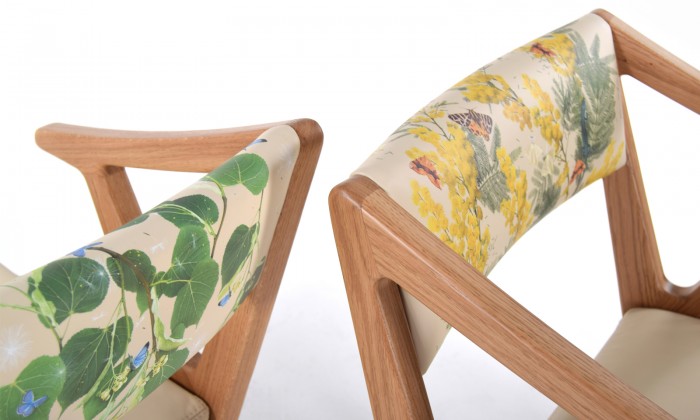 Following the meeting, Michael built two designs of Mimosa and Lime Tree and engineered them to specifically fit to the chair on single panels of leather that adhered to the upholstery technique of the chair. The patterns were chosen to enhance the substrate colour of the leather and to connect the interior with the exterior.
