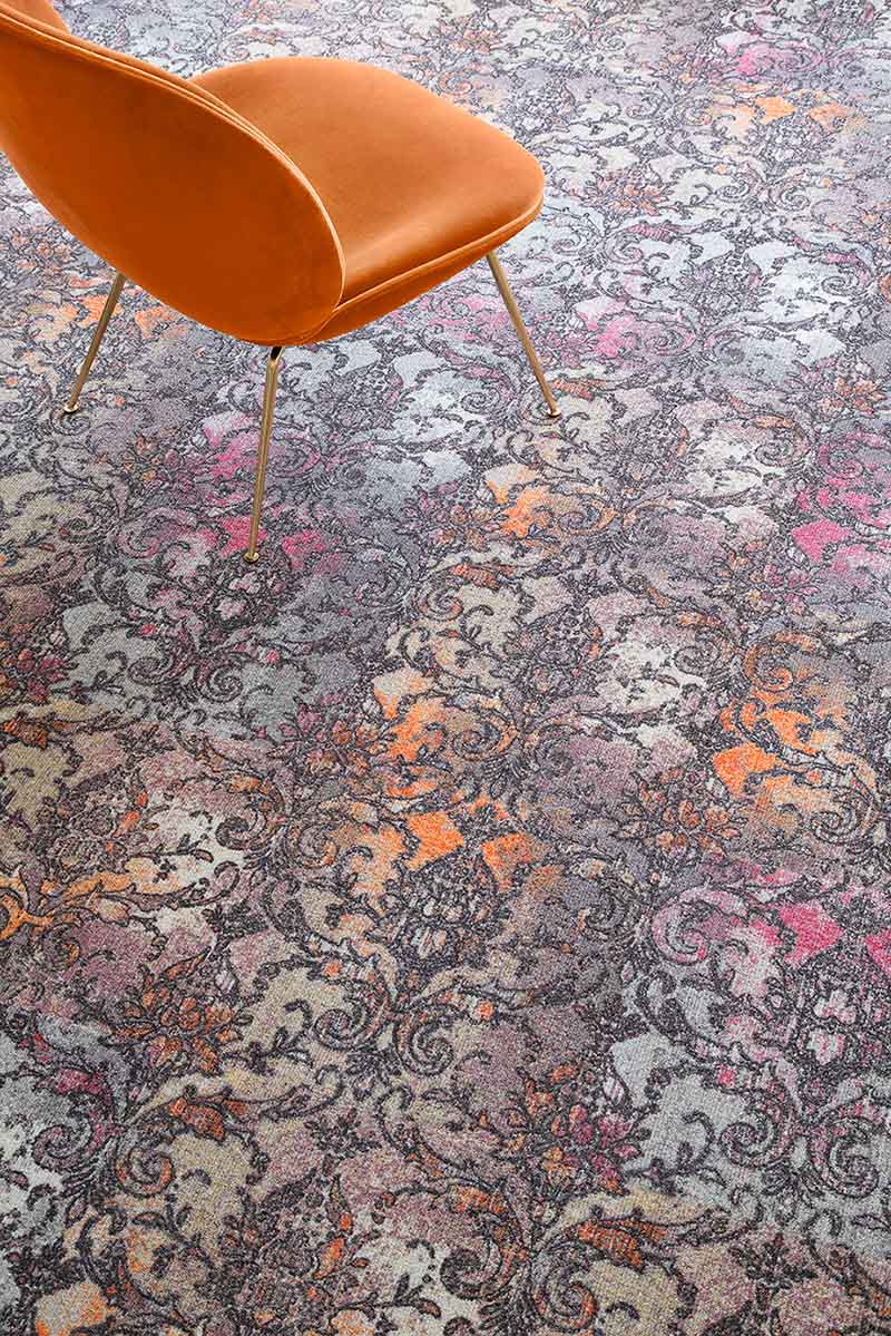 Artistic Liberties is a daring new collection from the Milliken in-house design team. It combines post-punk and street art influences with historic and classical references resulting in a liberation of clashing colours and twisted timelines. Artistic Liberties makes a traditional design contemporary and outspoken. The disparate sources of inspiration include ornate patterned jewels, elegant damask and brocade fabrics and the illicit marks made by a street artist’s spray can. The accidental and chaotic is married with the controlled and refined. While juxtaposition might be the starting point, the final collection successfully harmonises these seemingly discordant influences together.